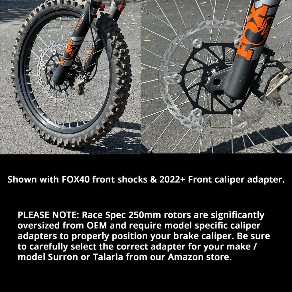 **Please note that Fox40 and Talaria 2022.5+ factory forks require an added m5 x 1mm & 2mm thick spacers for correct figment. The fitment also can vary based on if you have OEM calipers or aftermarket